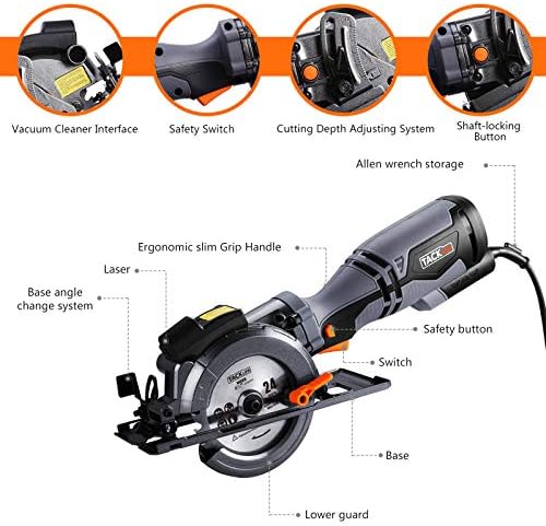 Innovative auxiliary handle patent design is ideal for reduce the fatigue of one-handed operation, providing extra stability when cutting metal, ceramic tiles, etc.710 W /5.8 A pure copper motor delivers 3500RPM running power to the compact circular saw for efficient cutting performanceAdjustable cutting angle ( 90°- 45° ), max cutting depth at 90° is 1-11/16 inches (42.9mm) and the bevel capacity at 45° is 1-3/8 inches ( 34.9mm )Under the laser guide, the mini circular saw ensures a professional and precise cutting line for cutting wood/plastic/metal/tileWith the adapter, it’s convenient to connect the dust port to your vacuum cleaner, ideal for maximizing dust collection efficiency to maintain a clean environmentThe rip guide is ideal for a parallel cuts with ease