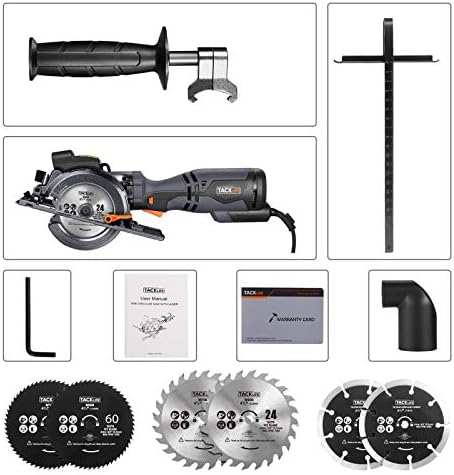 ➤VALUABLE ACCESSORIES: You will get: 1XTacklife TCS115A circular saw; 6 blades(2x120mm for wood cuts/2x115mm for wood and soft metal cuts/2x115mm for tile cuts); 1Xmetal handle; 1Xparallel guide; 1Xelbow dust port; 1Xhex key; user manual