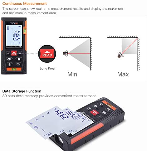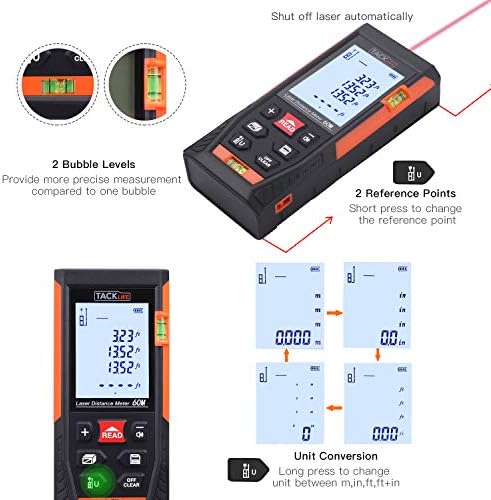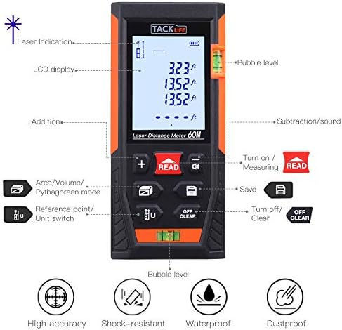 The Tacklilfe HD60 Classic Laser Measuring device is portabe and super easy to use; It is designed with versatile functions and especially for needs of high-precision distance measurements by using Laser Precision Technology.2 bubble levels, which provides more precise measurement compared to one bubble; Measuring range up to 196 Ft, Remarkable accuracy is ±1/16 inch; Fast measurement speed can improve your work efficieny greatly.Specifications:Measuring accuracy: ±1/16 inchMeasuring units: M/In/FtDisplay: Large LCD BacklitLaser class: Class 2Battery type: 1.5V 2*AAA(Included)