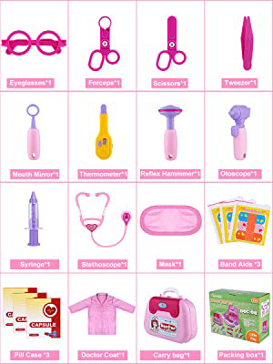 DOCTOR MEDICAL KIT for KIDS. Doctor Play Set comes with every imaginable tool that a future doctor will need, including a handy carrying case, Doctor Coat, Electronic Stethoscope, Mask, Otoscope, Reflex Hammer, Oral Mirror, Thermometer, Eyeglasses, Doctor Pliers, Doctor Scissors, Tweezers, Syringe, Pill Case *3, Band Aids *3, Doctor Stick.