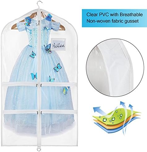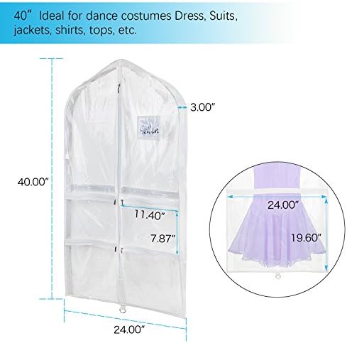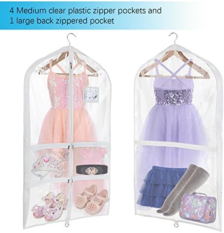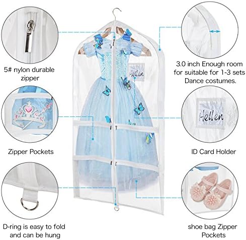 Size: 24″X40″X3″Durable & smooth nylon zipperD-ring is easy to fold and can be hungClear PVC with Breathable Non-woven fabric gussetAdd extra 4 Medium clear zipper pockets and 1 large back zippered pocketIdeal for children dance costumes, Dress, Suits,jackets, shirts, tops, coat etc.